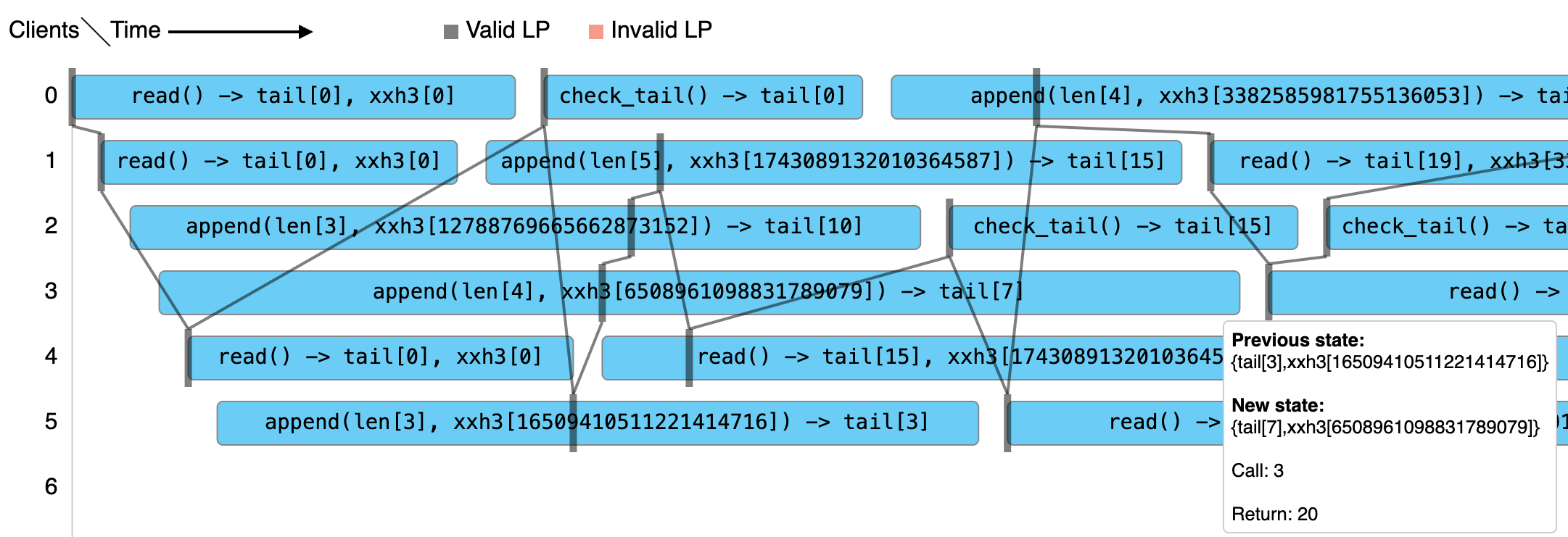 Our porcupine model can then try to assemble a linearizable history from our log. This even yields a neat visualization, where each step also displays the specific next possible states.