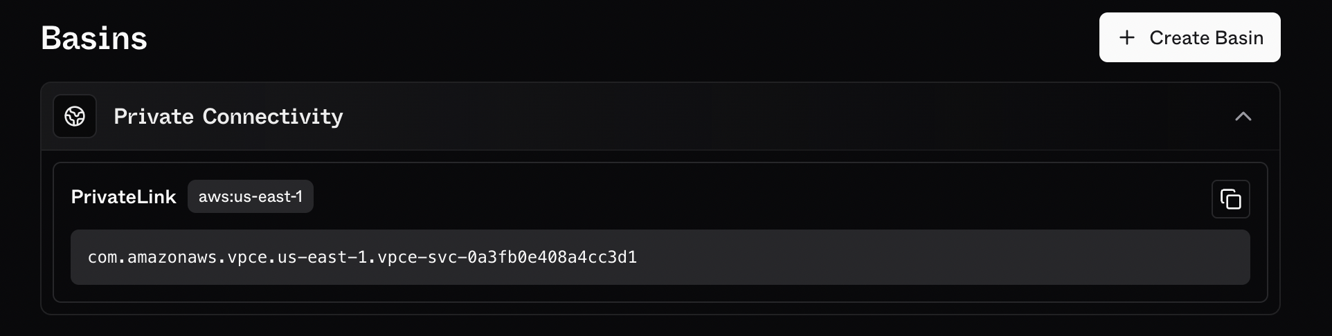 Go to the S2 dashboard, in the Basins tab, expand the Private Connectivity section to find your PrivateLink service name.