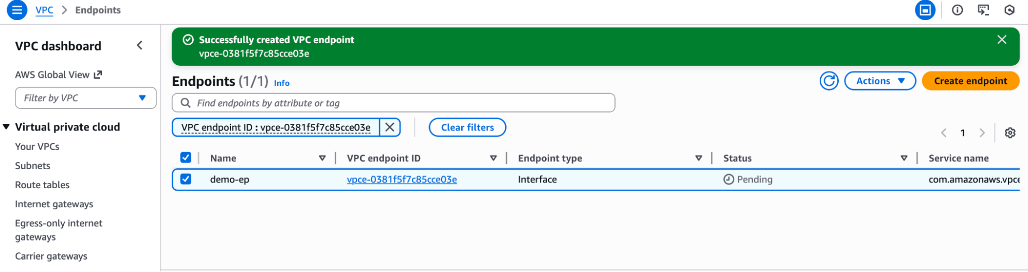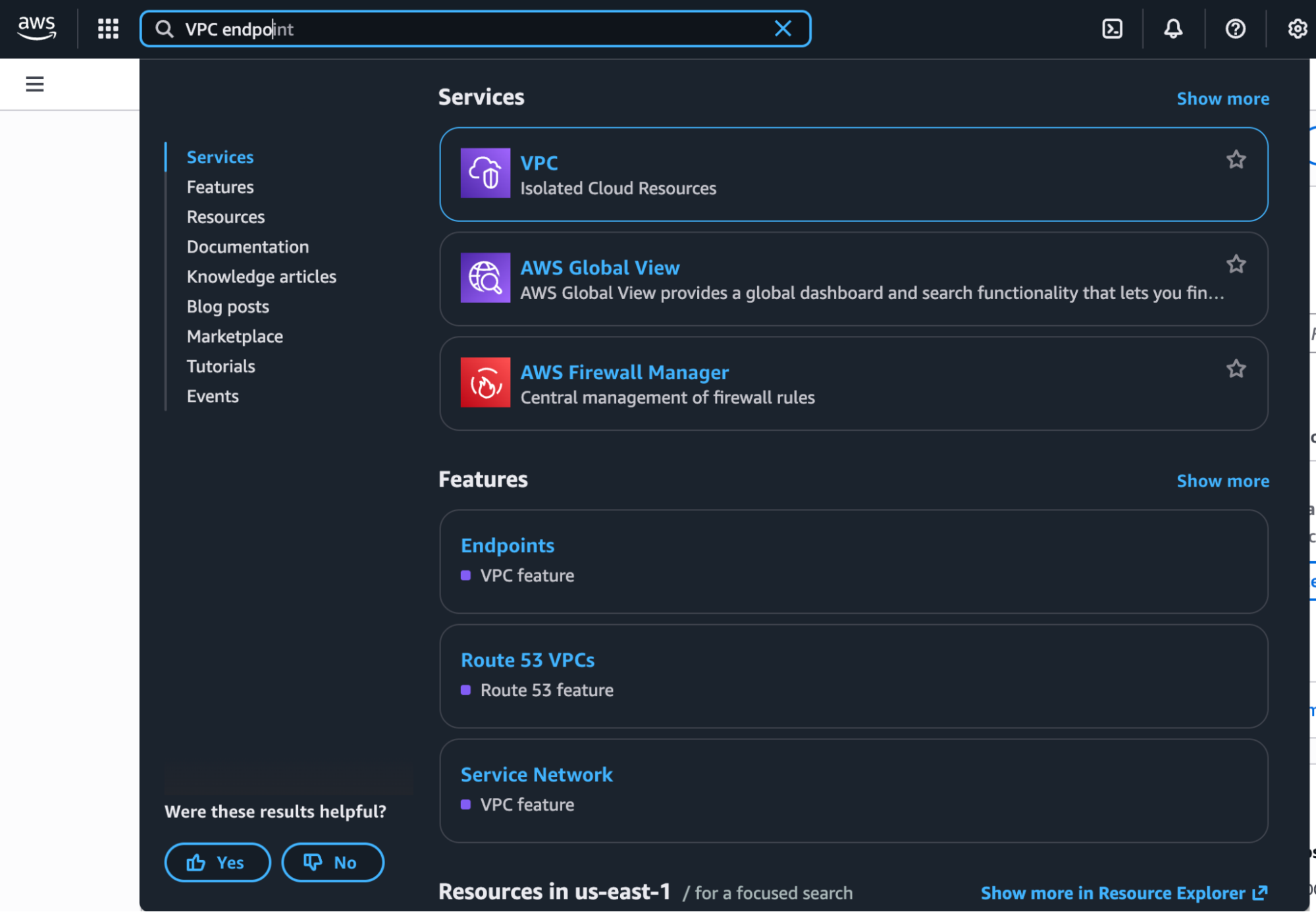 Search for VPC endpoint on the AWS console and select “Endpoints”.