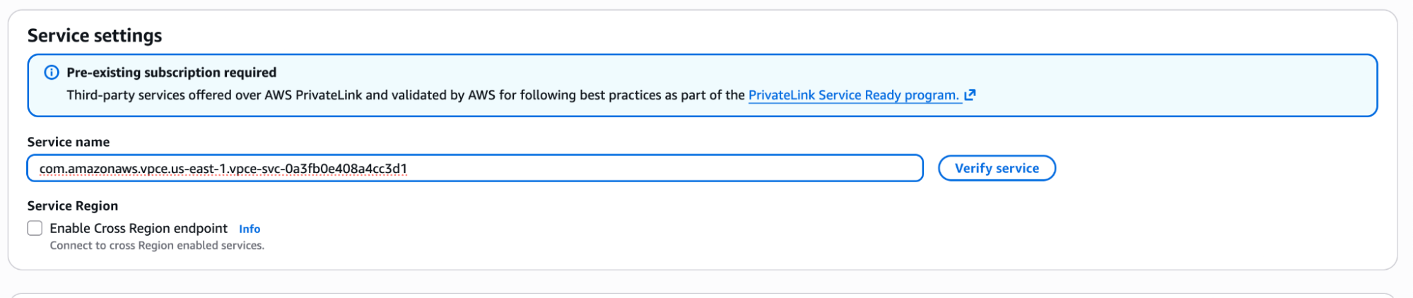 Enter the PrivateLink service name from the S2 dashboard and click on “Verify Service”.